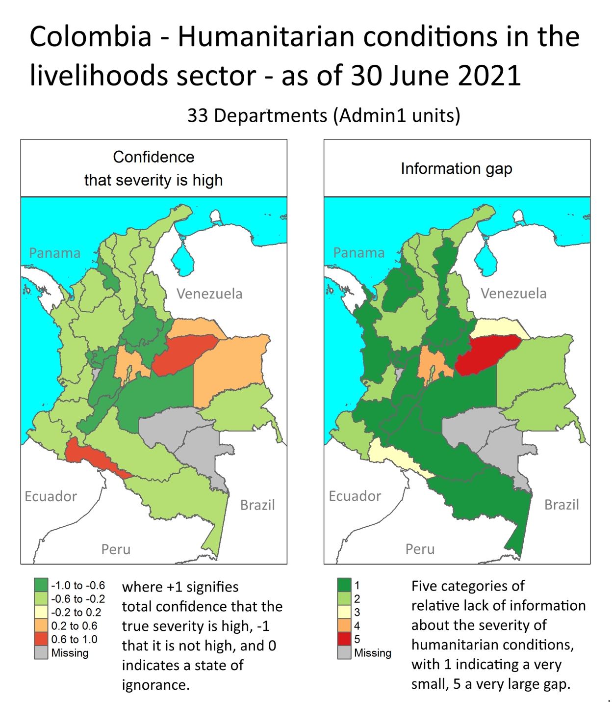 Humanitarian severity and information gap measures using Possibility Theory: Possibility Theory, a variant of probability theory, is well suited to analyze large-N measurements of variable reliability, obsolescence and redundancy. Very few applications are known from the humanitarian sector, and these are about stocks and flows of relief goods measured on continuous scales. We demonstrate the usefulness of Possibility Theory in testing the binary hypothesis that the severity of humanitarian conditions in a given region and sector is high / not high. The test relies on numerous ordinal severity ratings produced by coders who review humanitarian reports with location, time, sector, affected group and context information. Also, we propose an allied measure of information gaps.