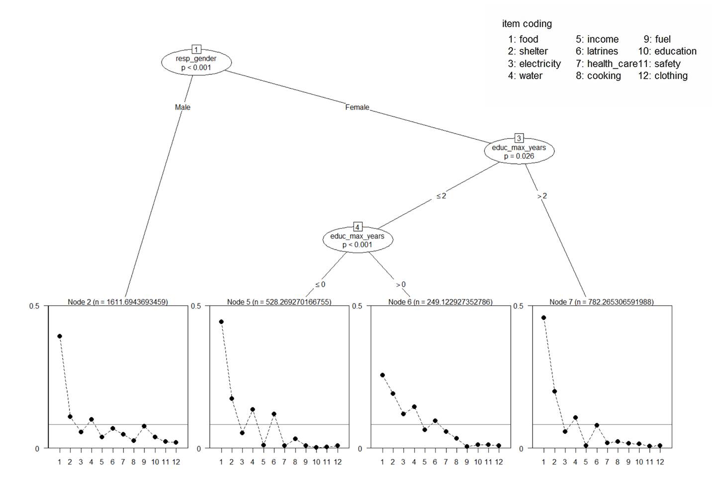In addition, Plackett-Luce trees identify and visualize statistically distinct need / priority etc. profiles by social group in response to vulnerability attributes. The algorithm finds the significant distinguishing attributes from a list of variables specified by the user.