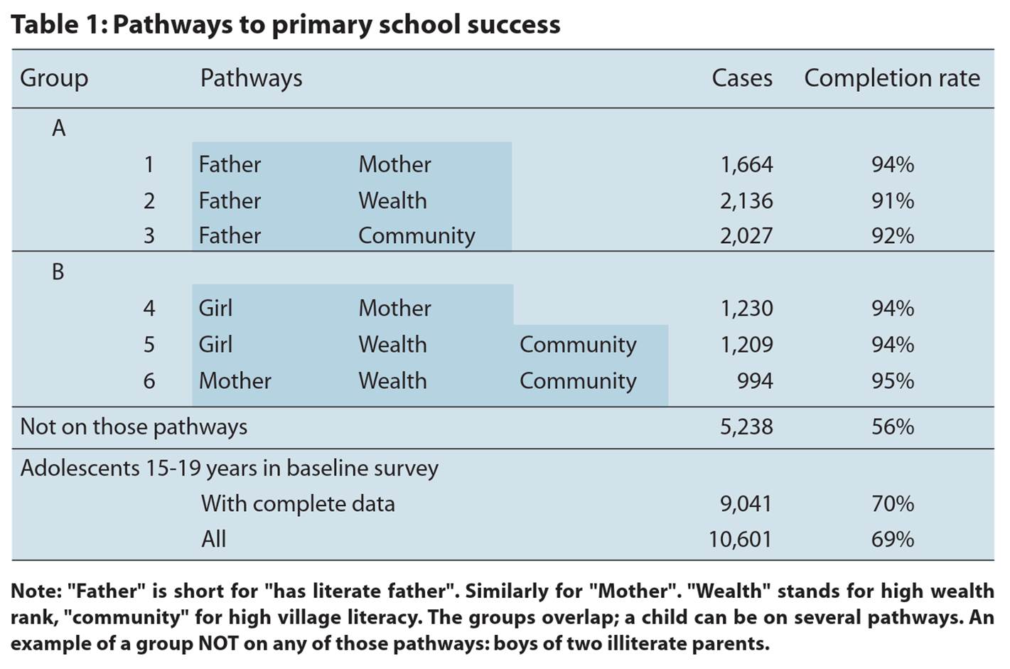 "It takes a village to put a child through school - Can community literacy substitute for parental literacy?" (2012, together with Wasima Samad Chowdhury) tests the relationship between parental literacy, community literacy rates and the primary school success of over 9,000 adolescents enumerated in a large village baseline survey in northeastern Bangladesh. It finds that chances to complete Primary Class V are very similar for children of illiterate parents in high-literacy villages and for those of two literate parents in low-literacy villages.
